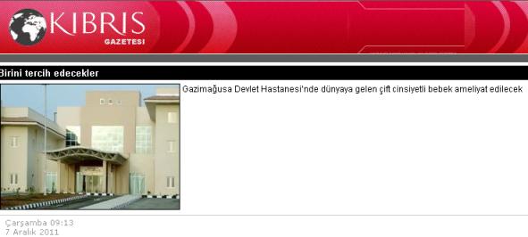 “Gazimağusa Devlet Hastanesi’nde dün, çift cinsiyetli bir bebek dünyaya geldi. Gazimağusa’ya bağlı köylerden birinde yaşayan V.K. – H.K. çifti, bebek sahibi olmanın mutluluğunu yaşarken “çift cinsiyetli” bir çocuklarının olduğunu öğrenince şok oldu.
